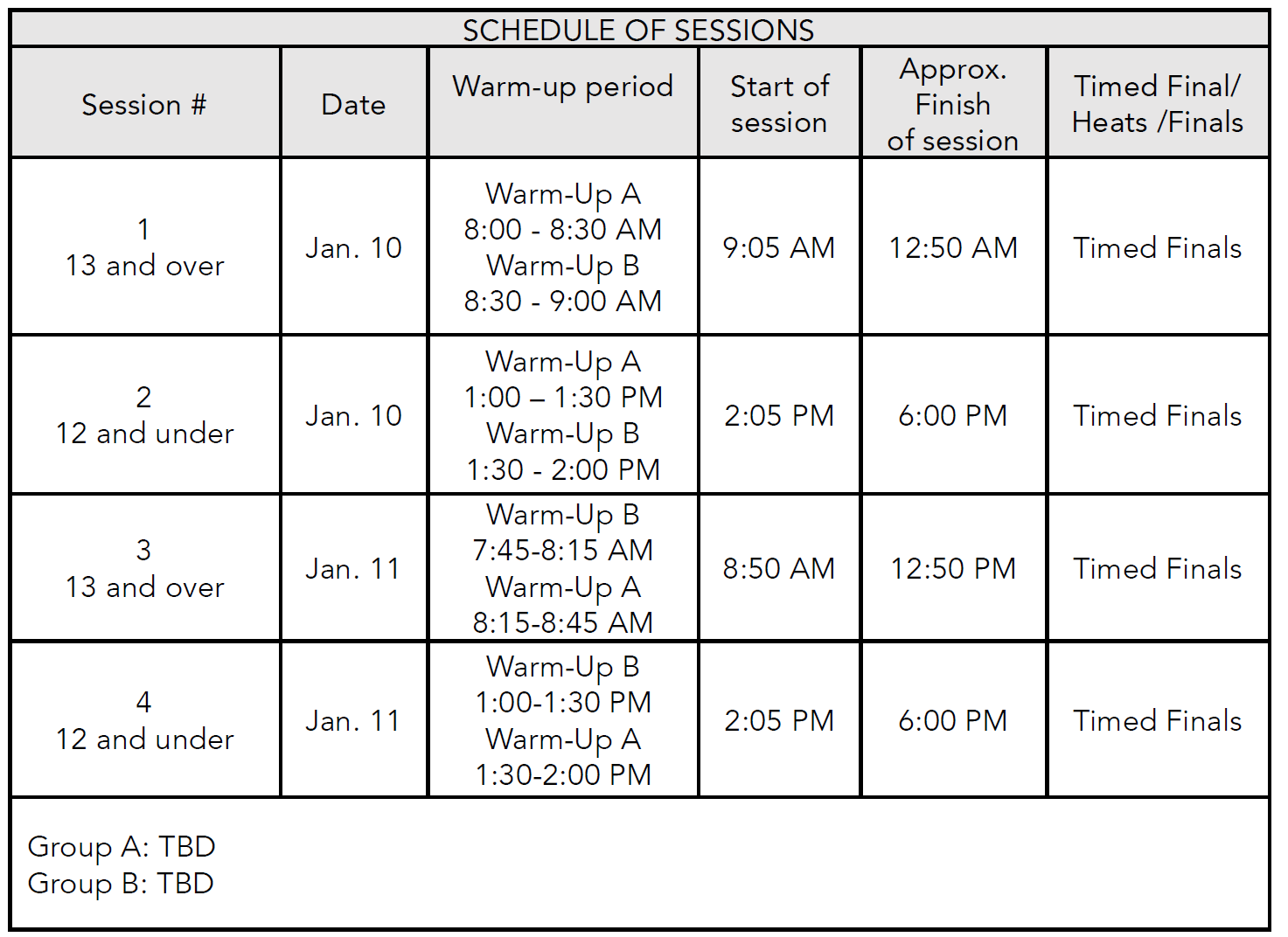 Full details about session and ​events are detailed in the meet package.  Depending on abilities/events offered, swimmers can swim 1 - 3 events per session at the coaches' discretion. All events are selected by the coaching team.