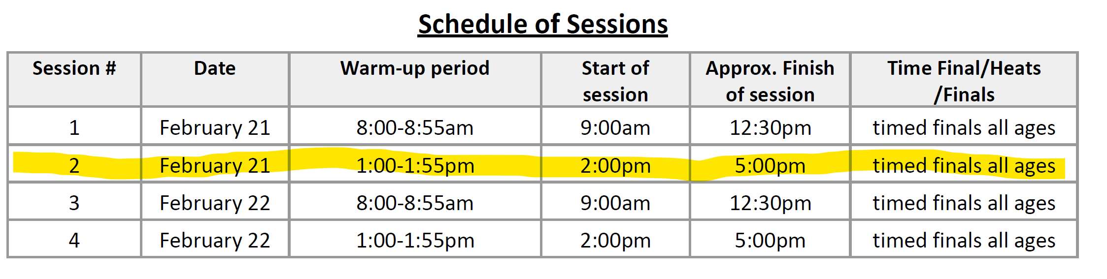 This is a timed finals meet with all ages in the same session. The program will repeat from morning to afternoon to allow flexibility for clubs to attend sessions with all swimmers..