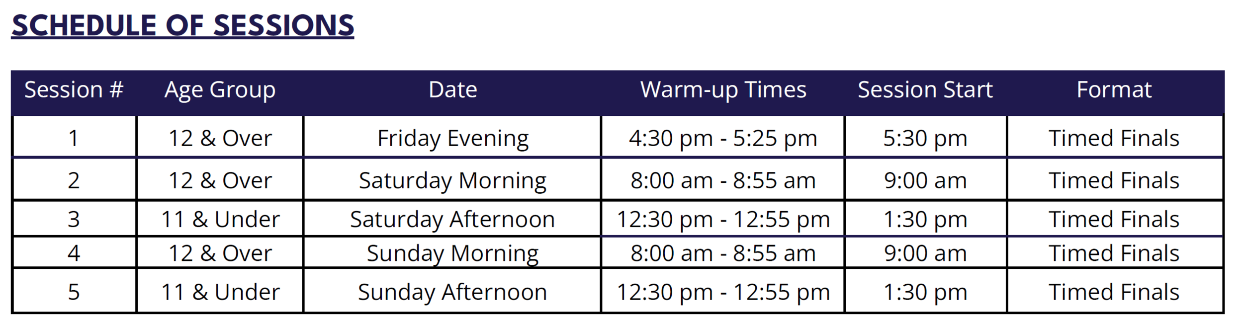 Full details about session and ​events are detailed in the meet package.  Depending on abilities/events offered, swimmers can swim 1 - 3 events per session at the coaches' discretion. All events are selected by the coaching team.