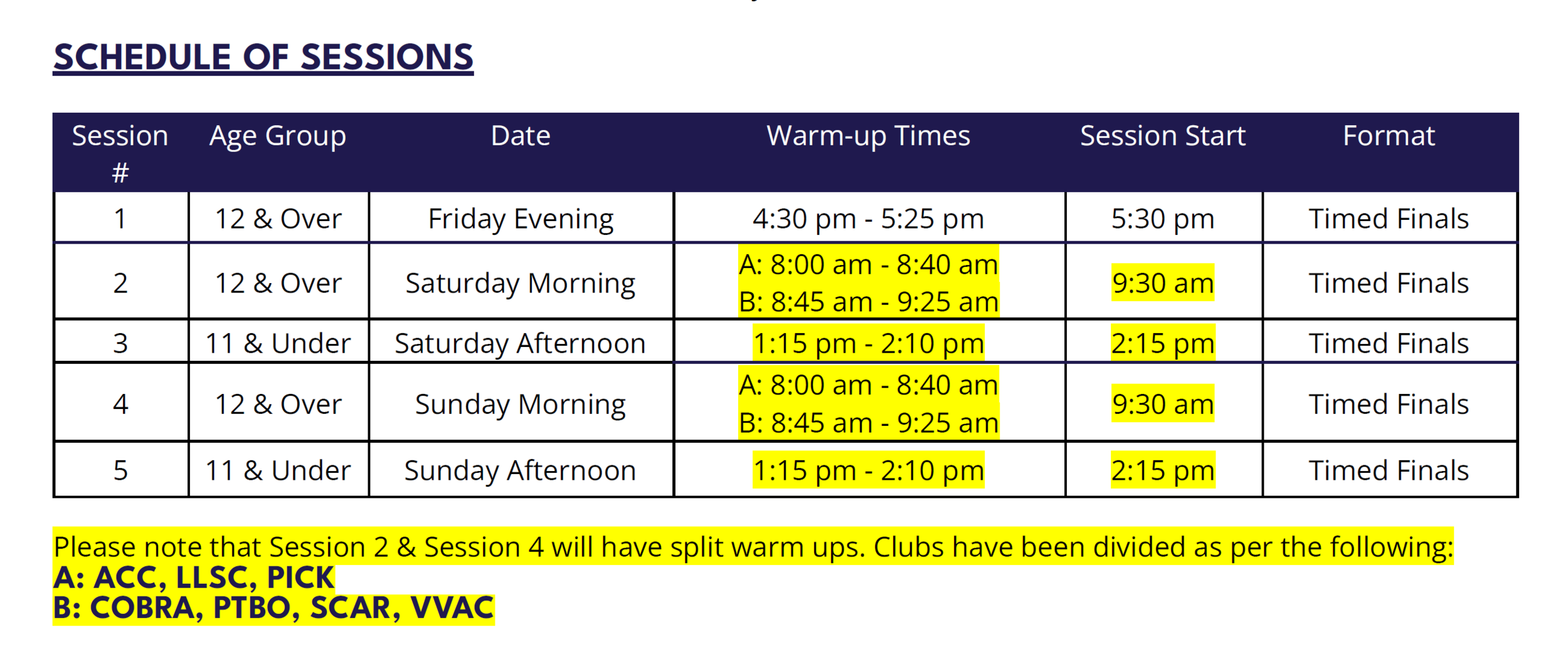 Full details about session and events are detailed in the meet package, updated on Nov 25th. Depending on abilities/events offered, swimmers can swim 1 - 3 events per session at the coaches' discretion. All events are selected by the coaching team.